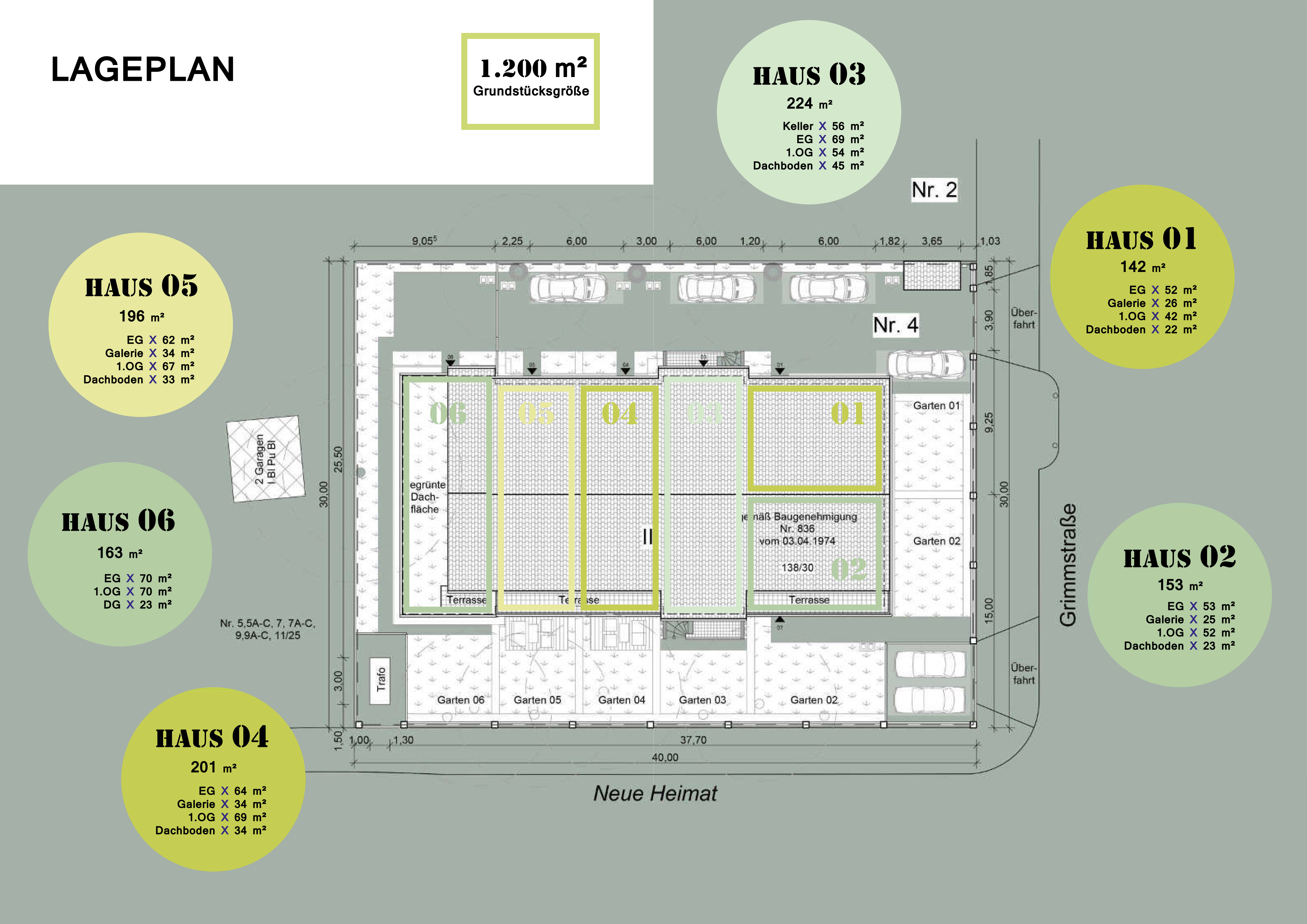 Bei dem renovierten Gebäude in der Grimmstraße handelt es sich um ein ehemaliges Umspannwerk, das in sechs Reihen-Lofts umgebaut wurde. Jedes Loft hat zwischen 142 und 224 m2 Wohnfläche, mit drei oder vier Etagen - inklusive Keller und Dachgeschoss. Die einzelnen Etagen sind durch Treppen aus Beton oder Massivholz verbunden. Aufgrund der Deckenhöhe von über fünf Metern wurden in jedem der vier Häuser eine Galerieebene eingezogen. Dies verleiht den Häusern ein großzügiges Ambiente. Darüber hinaus wurde ein Obergeschoss geschaffen, das zusätzlichen Wohn- und Nutzraum bietet. Jedes der sechs Häuser ist individuell geplant. Haus drei hat zum Beispiel eine spektakuläre Besonderheit: Ein vorhandener Gewölbekeller wurde über eine Wendeltreppe erschlossen und verleiht dem Haus einen außergewöhnlichen Charme.