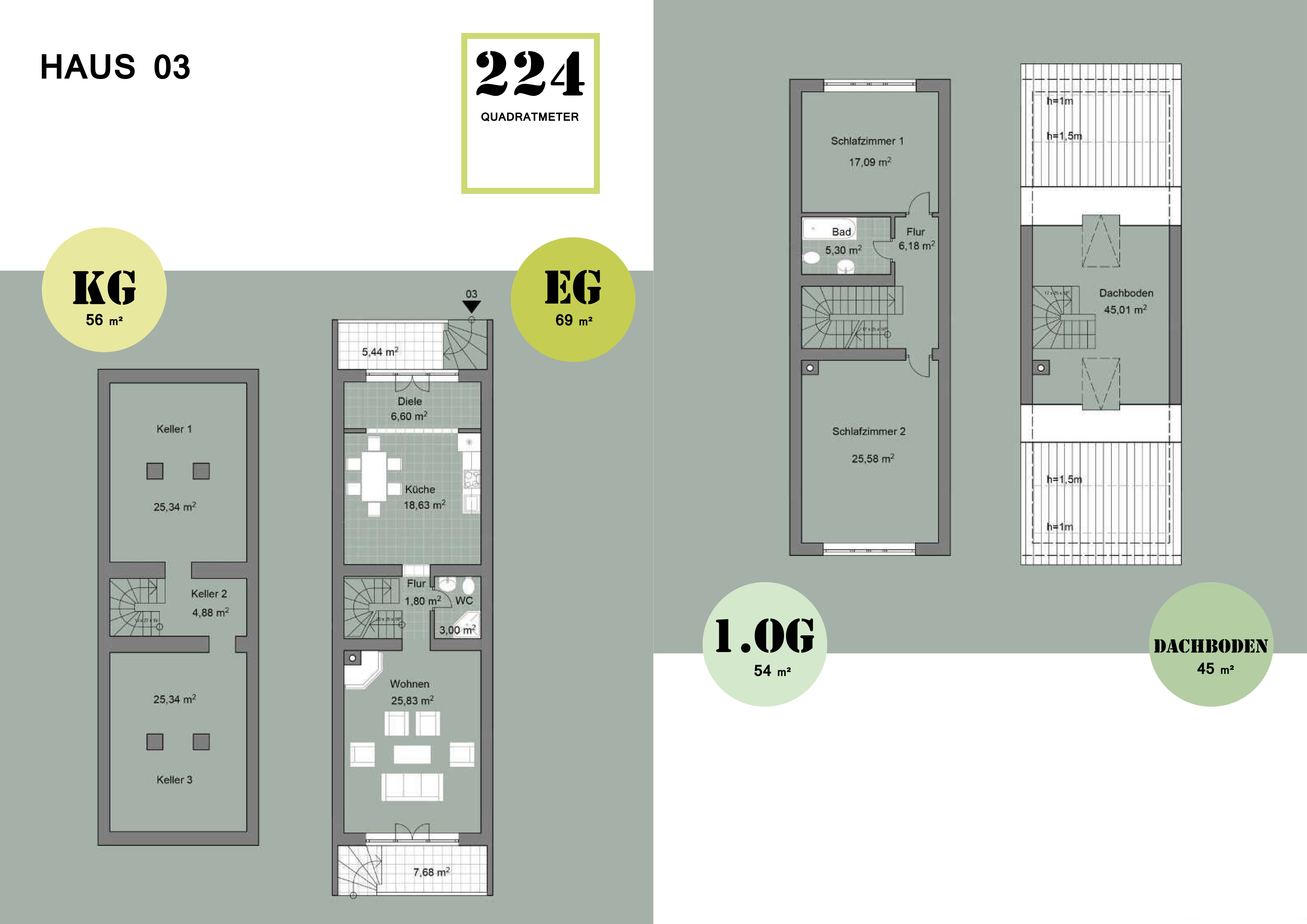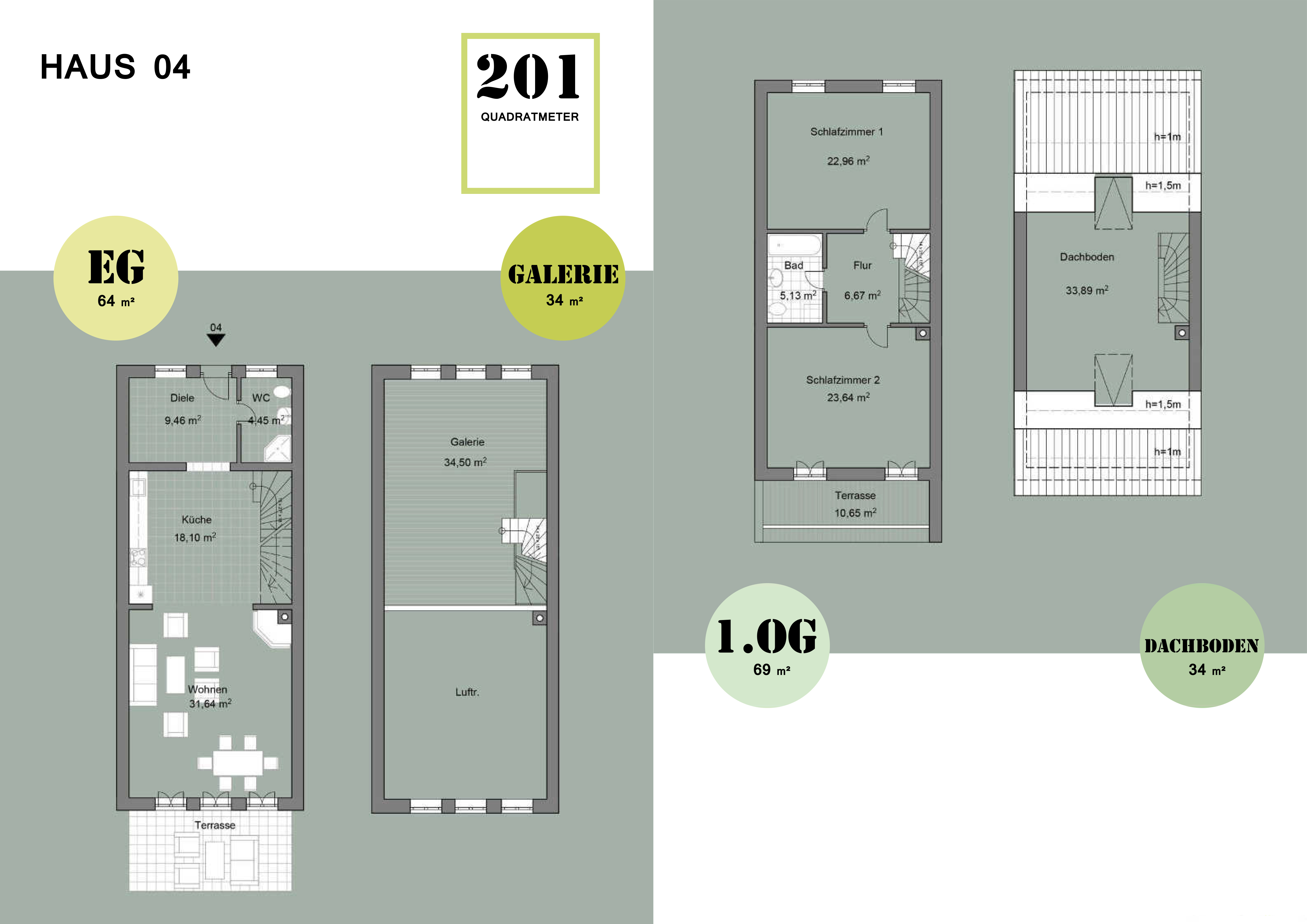 Bei dem renovierten Gebäude in der Grimmstraße handelt es sich um ein ehemaliges Umspannwerk, das in sechs Reihen-Lofts umgebaut wurde. Jedes Loft hat zwischen 142 und 224 m2 Wohnfläche, mit drei oder vier Etagen - inklusive Keller und Dachgeschoss. Die einzelnen Etagen sind durch Treppen aus Beton oder Massivholz verbunden. Aufgrund der Deckenhöhe von über fünf Metern wurden in jedem der vier Häuser eine Galerieebene eingezogen. Dies verleiht den Häusern ein großzügiges Ambiente. Darüber hinaus wurde ein Obergeschoss geschaffen, das zusätzlichen Wohn- und Nutzraum bietet. Jedes der sechs Häuser ist individuell geplant. Haus drei hat zum Beispiel eine spektakuläre Besonderheit: Ein vorhandener Gewölbekeller wurde über eine Wendeltreppe erschlossen und verleiht dem Haus einen außergewöhnlichen Charme.